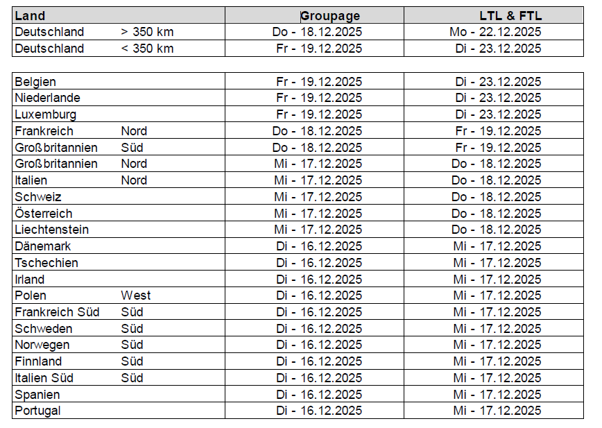 wir sind auch zwischen Weihnachten und Neujahr erreichbar, um Ihre Sendungen kurzfristig europaweit auszuliefern. Damit Ihre Lieferungen vor dem Weihnachtsfest noch auf normalem Wege bei Ihren Kunden zugestellt werden können, bitten wir Sie, folgende konventionelle Abfahrten zu berücksichtigen: